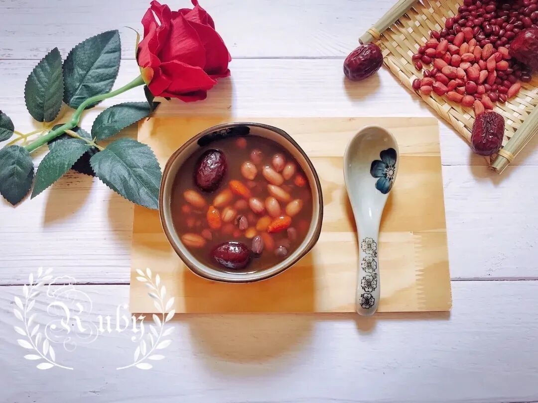 1. 红豆和花生提前泡1小时;2. 红枣洗净去核;3. 将红豆、花生和红枣放入锅内,并加入1.5L的清水;4. 大火煮开后转中火,盖盖子煮40-60分钟;5. 放入枸杞红糖再煮10分钟就可以关火了。