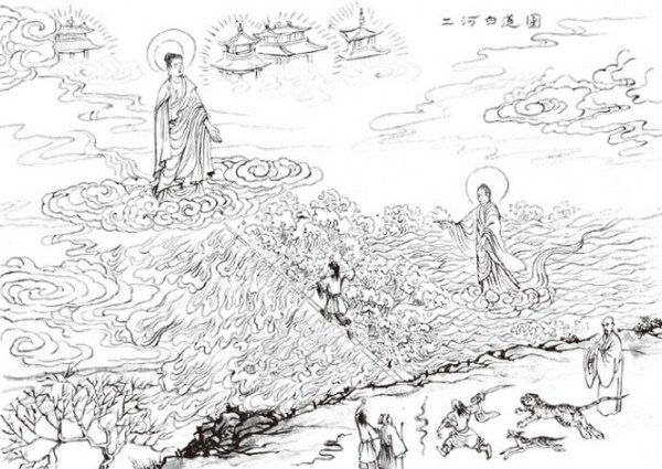 大师不仅以自修及演说利益众生,还慈悲留下《观经四帖疏》《往生礼赞》《观念法门》《法事赞》《般舟赞》《临终正念文》等著作化导群萌。如大师在《观经四帖疏》中以“水火二河白道喻”给末法业障凡夫吃了一颗成就往生信心的定心丸。若有众生,尽管不能断除贪欲(水河)和瞋恚(火河),但有真实愿往生心(白道),信愿称名,临命终时,必定乘佛愿力,往生西方。